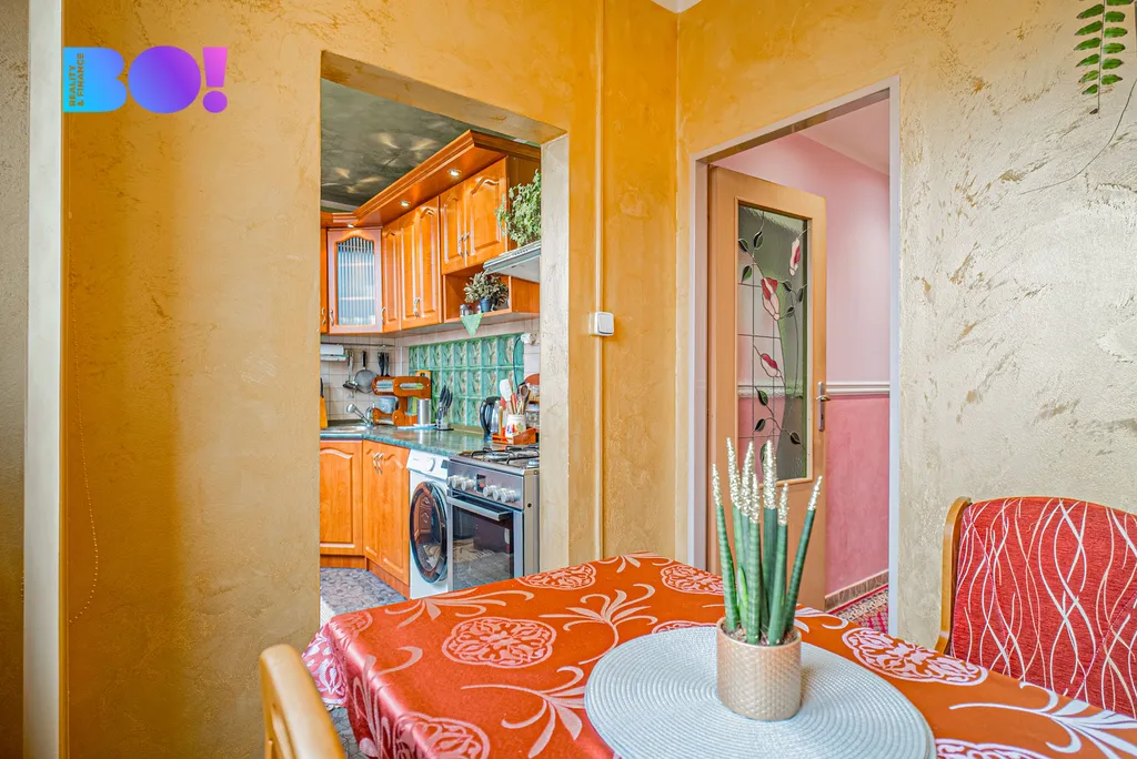 Dispozice bytu je velmi promyšlená. K dispozici je vstupní chodba s místem pro odložení věcí, koupelna s vanou, samostatné WC s umyvadlem, kuchyně s jídelním koutem, obývací pokoj, předsíň a tři samostatné pokoje, z nichž jeden má přímý vstup na lodžii. Díky dobře rozvrženému prostoru působí byt vzdušně a nabízí vysoký komfort pro každodenní bydlení.