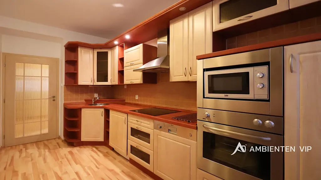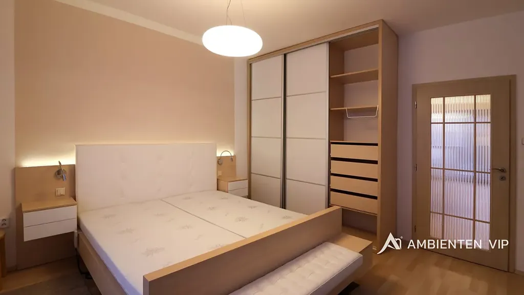 Byt je po částečné rekonstrukci z roku 2019 a kompletně zařízen kvalitním nábytkem na míru s důrazem na praktičnost a estetiku. Dispozici bytu tvoří vstupní hala, velkorysý obývací prostor s pracovním koutem (32 m²), prostorná ložnice s vestavěnými skříněmi a dalším pracovním stolem, samostatná kuchyně plně vybavená spotřebiči (lednice, sklokeramická deska, trouba, digestoř, mikrovlnná trouba, myčka). K dispozici je také pračka a TV. Součástí bytu je sklep v suterénu bytového domu, kam vede i výtah.
