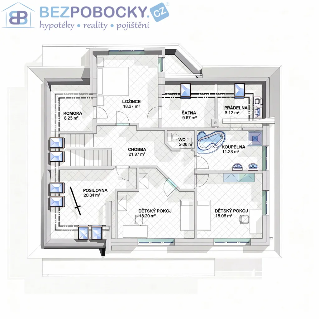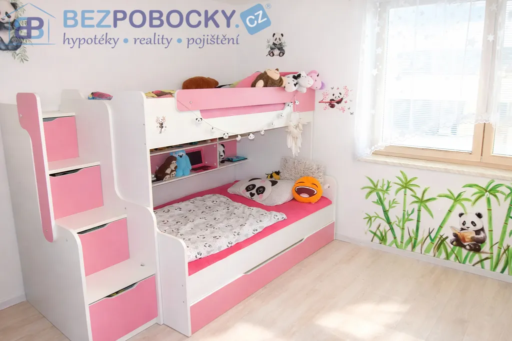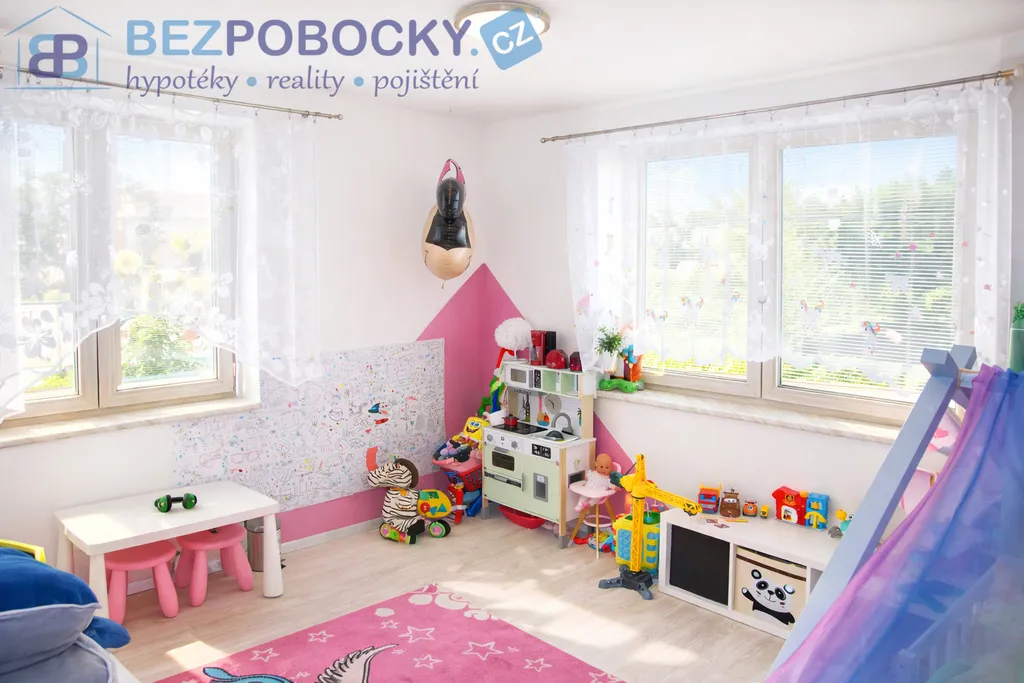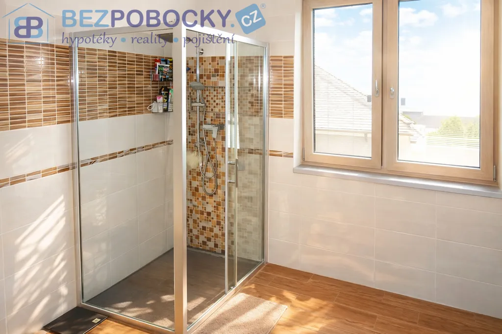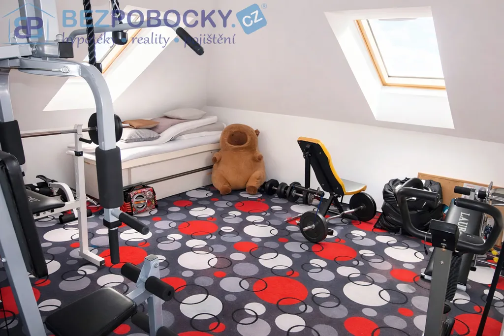 Po prostorném světlém schodišti se dostaneme do patra domu a zde se nachází hlavní ložnice, která disponuje vlastní šatnou a další místností kterou lze použít dle představ nového majitele. V patře se dále nacházejí další tři velkorysé pokoje, které mají dostatek přirozeného světla. Dva pokoje v současné době slouží jako dětské a třetí jako posilovna. Dále je zde velice prostorná koupelna se sprchovým koutem a rohovou vanou. Z koupelny přístupná prostorná prádelna s technickou místností skrývá pračku, sušičku, bojler na teplou vodu, elektrický kotel a akumulační nádrž na teplou vodu, která je napojena a ohřívána krbem.