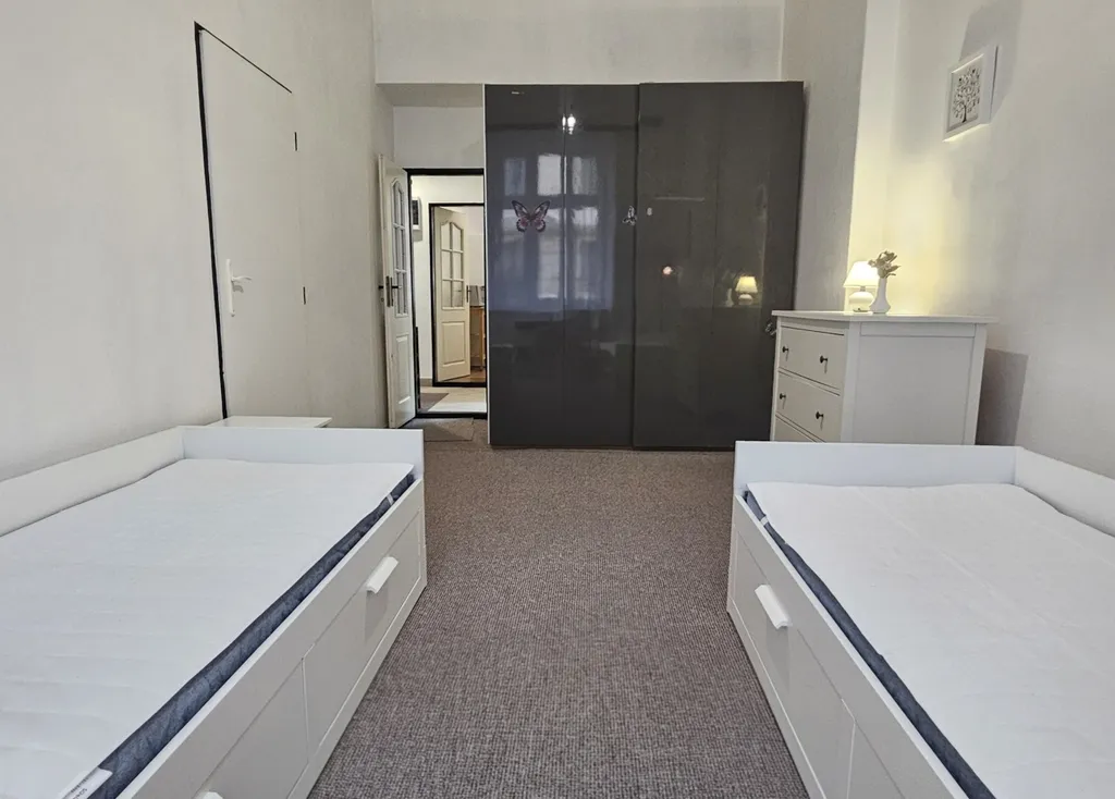 Byt je po právě dokončené rekonstrukci. Celý byt je vyštukovaný a vymalovaný bílou barvou, má nové el. rozvody, kompletně zrekonstruovanou koupelnu, nové položené koberce, nový moderní bojler 80L s eko režimem, nový kombinovaný sporák a novou pračku. Byt je plně vybavený nábytkem včetně kuchyňské linky s novým sporákem, digestoří, lednicí s mrazákem, mikrovlnnou troubou, rychlovarnou konvicí a TV. Nábytek je viz foto včetně 4 rozkládacích postelí s novými matracemi a úložným prostorem. Každou postel je navíc možné rozložit na dvojlůžko o šířce 160 cm x 200 cm (v případě potřeby je možné některou postel odvézt). V obou ložnicích je také velká vestavěná šatní skříň. V koupelně je vana, umývadlo a nová pračka. WC je zvlášť. Na podlaze jsou nové koberce a dlažba. Topení je výkonnými WAW, ohřev vody zajišťuje nový moderní eco bojler. Ve dvoře domu je možné sušit prádlo. Parkování je možné na ulici.