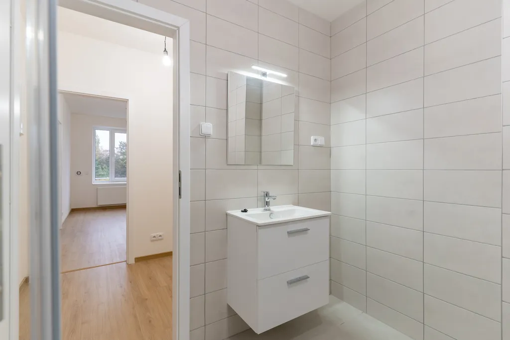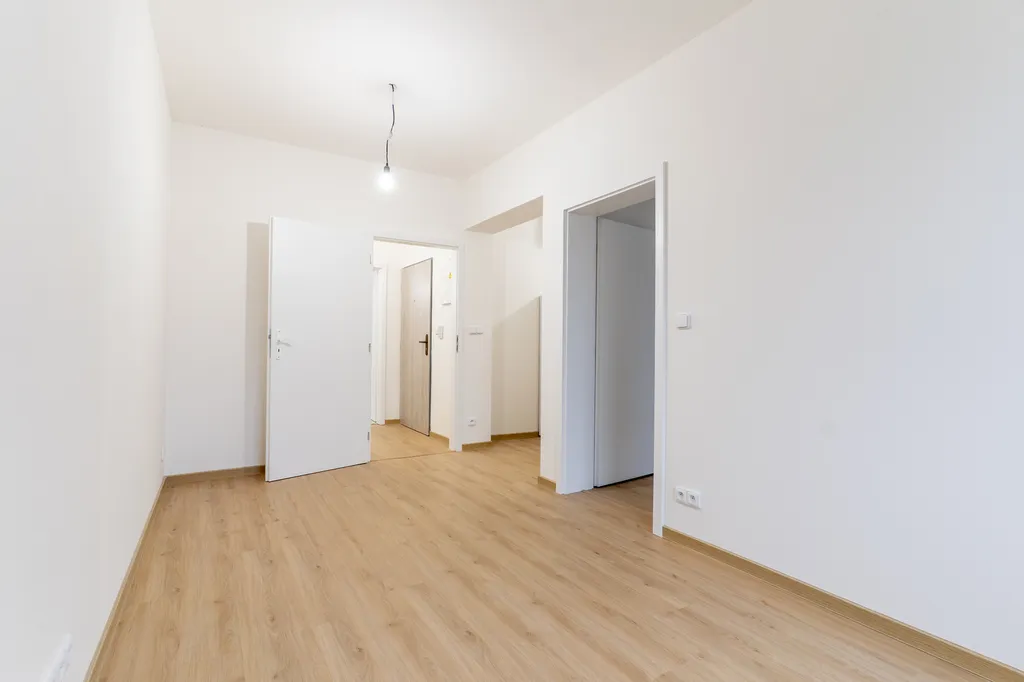 Byt je dispozičně řešený jako 2+kk, jeho výměra činí 43,13 m² a je orientovaný na jihozápad směrem do ulice. Kuchyňský kout je umístěn samostatně v oddělené části místnosti, což zvyšuje celkový komfort a praktičnost prostoru. K bytu náleží také sklepní kóje o velikosti 1 m².