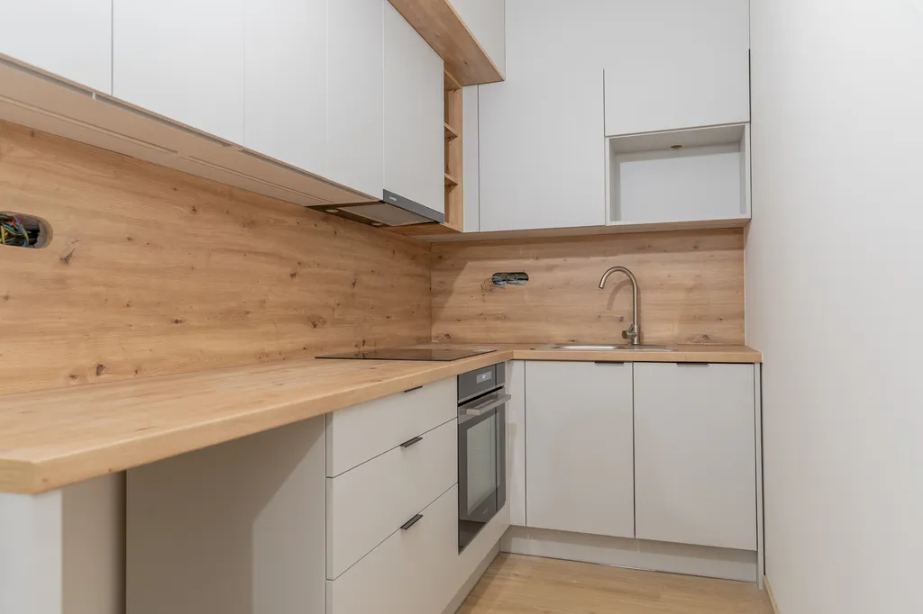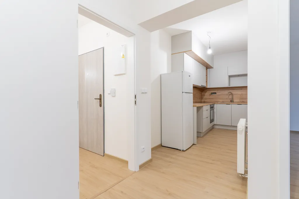 Byt disponuje zcela novou kuchyňskou linkou s vestavěnými spotřebiči, mezi které patří myčka nádobí, sklokeramická varná deska, elektrická trouba, digestoř a lednice s mrazákem. Součástí nájmu není pračka, nicméně v kuchyni je připravený prostor pro její instalaci. V bytě jsou již nainstalována všechna světla i zásuvky.