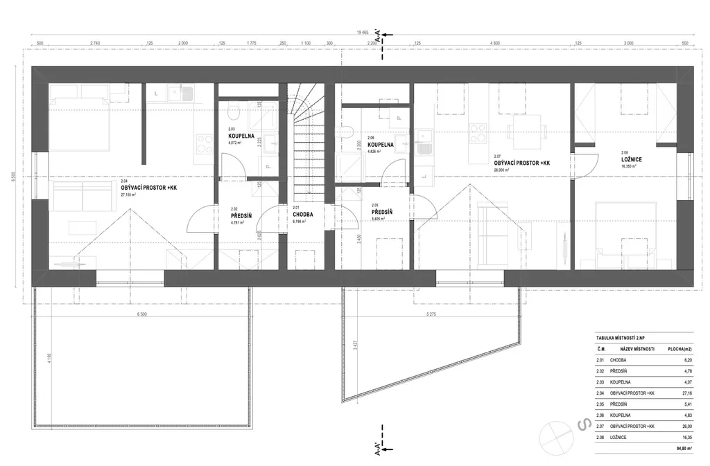 Apartmán 1: 36,01 m² + terasa cca 26,5 m²