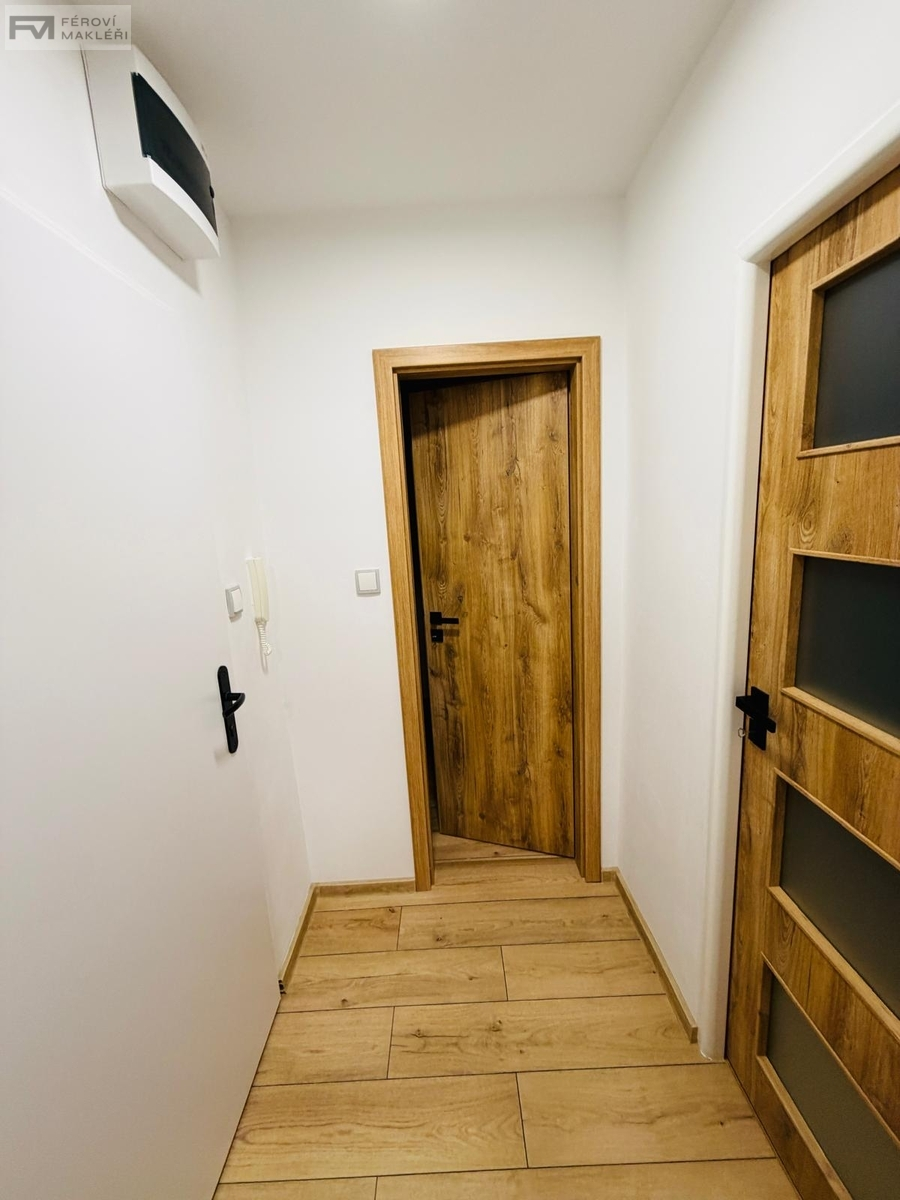 Nabízíme Vám k pronájmu bytovou jednotku o dispozici 1+1 a výměře 26 m2, umístěnou v 7. podlaží panelového domu ve vyhledávané lokalitě se spoustou zeleně a v blízkosti všech služeb města. Byt prošel zdařilou celkovou rekonstrukcí s akcentem na přírodní vzhled. Dispozice bytu jsou samostatná kuchyň a samostatný pokoj. z předsíně je vstup koupelny a WC. Okna bytu směřují na východ, takže je světlý, slunný a není v něm v létě horko. K bytu náleží sklepní kóje. Dům je udržovaný, má dva výtahy a do bytu je bezbariérový přístup z chodníku až do obýváku. V okolí domu je dostatek míst k parkování. Samotné umístění domu je v blízkosti základní občanské vybavenosti a výbornou dopravní dostupností. Byt je situován v příjemném místě s vyhlídkou na hory. Měsíční nájem 11000,- Kč, poplatky 712,- Kč, pojištění domácnosti 150, Kč, provize RK 11000,- Kč, vratná dvouměsíční kauce nebo pojištění nájmu 3500,- Kč/rok. Jelikož je tento byt je ještě voní novotou, neváhejte s prohlídkou, pokud chcete být první nájemníci.