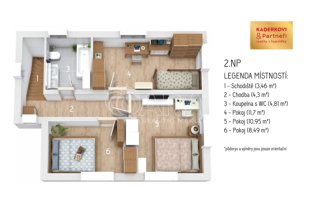 2. NP nabízí tři samostatné pokoje a druhou koupelnu s toaletou – ideální uspořádání pro rodinu i práci z domova.