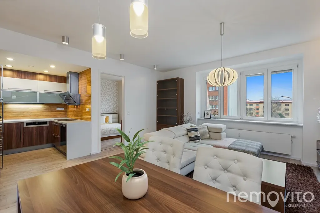 Prostorný byt 3+kk o ploše 86 m2 s vyšším stropem, velkými okny, sklepem a dvěma šatnami. Jednotka prošla v roce 2012 kompletní rekonstrukcí (vč. skladby stropu) a je ve špičkově zachovalém stavu. Byt, který je bez investic, prošel také změnou dispozice, která měla za následek vytvoření velkého obýváku a dvou zón - každá ložnice je na opačné straně bytu.