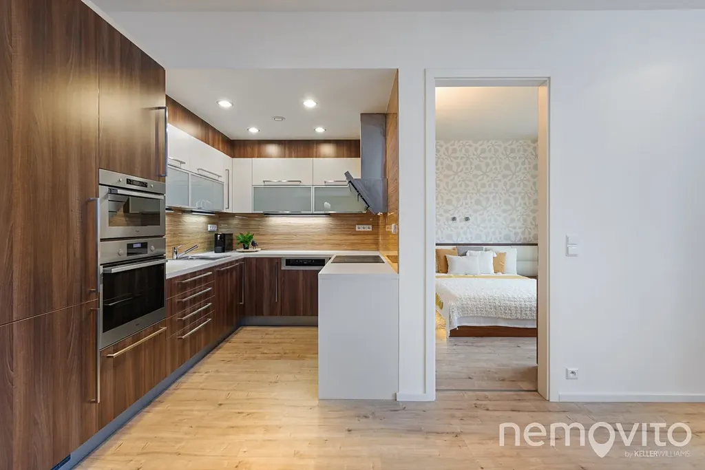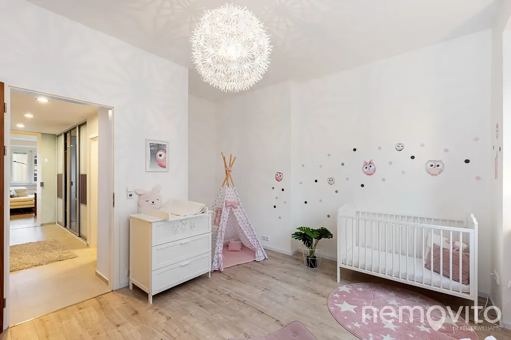 Obývák s kuchyní má velikost 34 m2 a velké okno západním směrem. V kvalitní lince nechybí všechny vestavěné spotřebiče včetně vinotéky. Ložnice rodičů je umístěna u obýváku a k dispozici má svou vlastní šatnu. Větší dětský pokoj (17 m2) je orientovaný směrem do dvora domu. Na chodbě je v rámci vestavěné skříně ukrytá také velká samostatná šatna a technické zázemí.