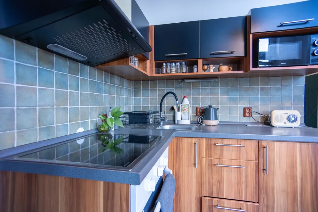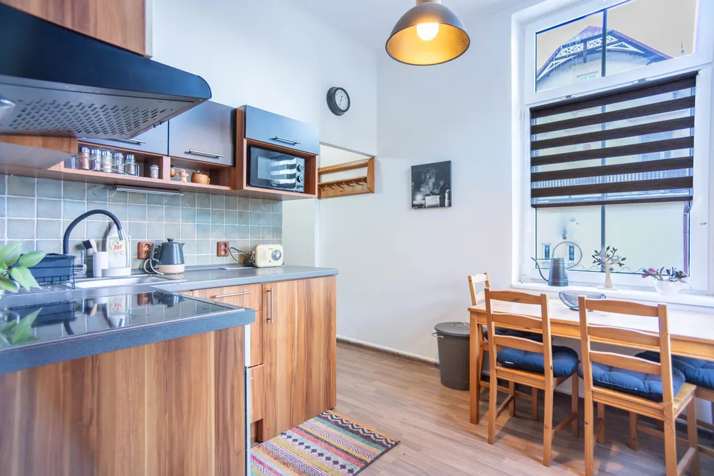 Byt disponuje vstupní chodbou s přímým vstupem do kuchyně s jídelnou, koupelnou s WC a sprchovým koutem a obytným pokojem, kde je umístěno horní spaní s prakticky skrytou šatnou. Vestavěné skříně a spotřebiče jsou součástí pronájmu.