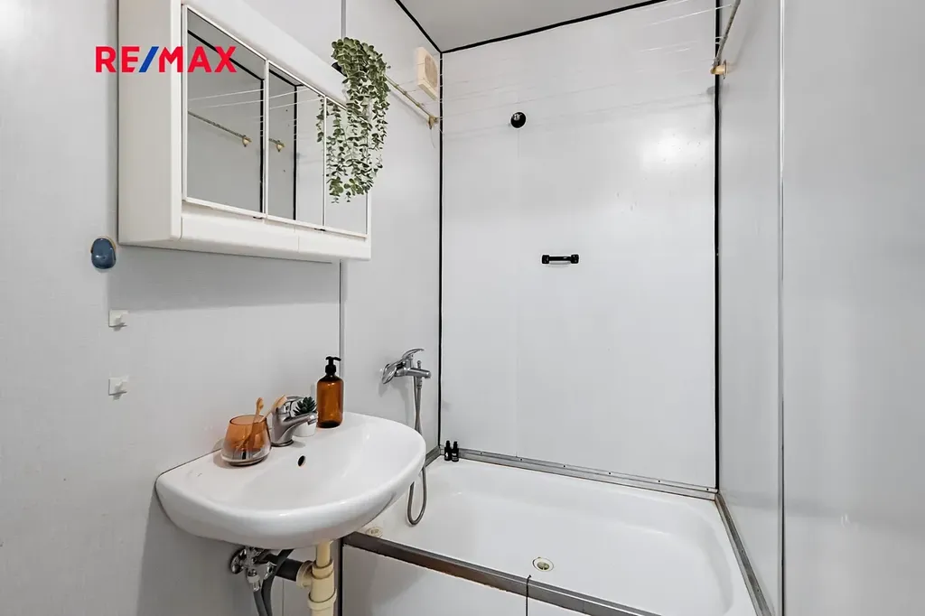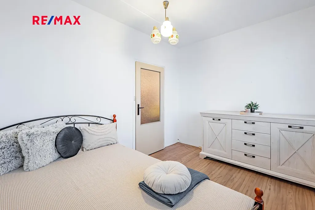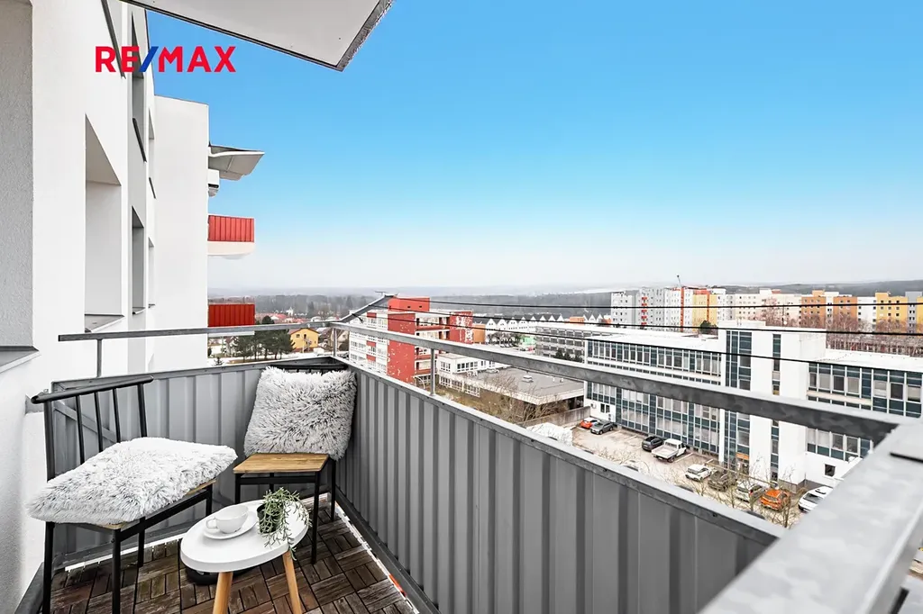 Byt se nachází v sedmém patře (osmém nadzemním podlaží) revitalizovaného panelového domu s výtahem. Při vstupu do bytu se nacházíme v předsíni. Po naší pravici se nachází úložný prostor vhodný pro uskladnění oděvů. Dále se na pravé straně bytu nachází koupelna a oddělená toaleta. Nalevo pak najdete samostatnou ložnici. Zbývající část bytu tvoří obývací pokoj spojený s kuchyňským koutem. Velkým benefitem je prostorný balkon právě u této místnosti. A aby toho nebylo málo, k bytu náleží hned dvě sklepní kóje, přičemž nelze opomenout ani společnou kolárnu (vše v přízemí domu).