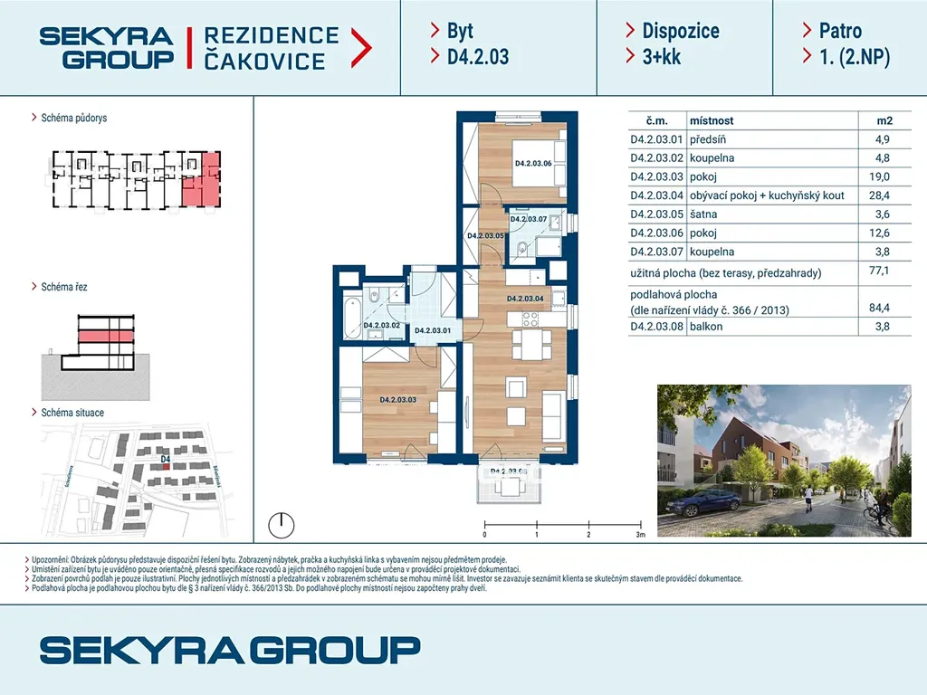 Dovolujeme si Vám nabídnout k prodeji byt 3+kk o výměře 84,4 m² s balkónem 3,8 m² v rezidenčním projektu Rezidence Čakovice.