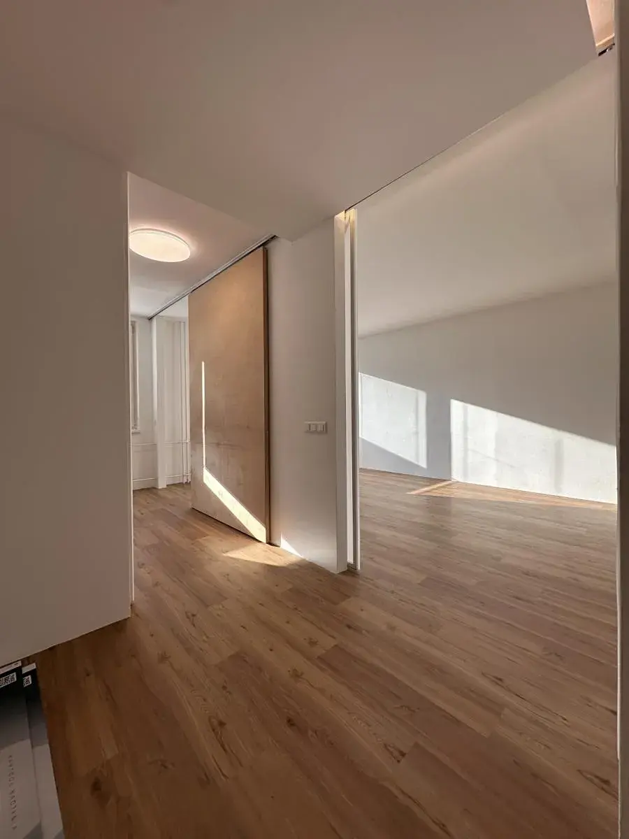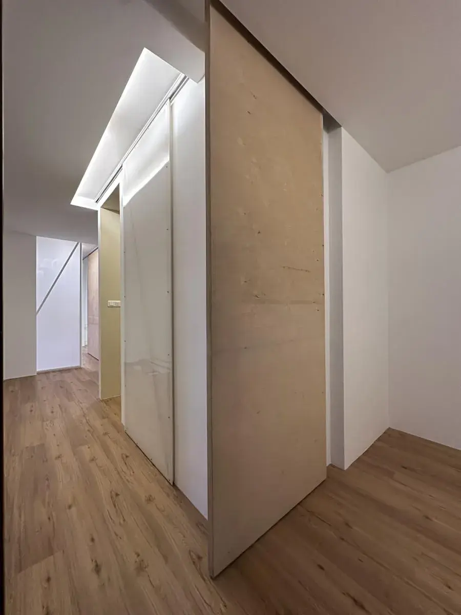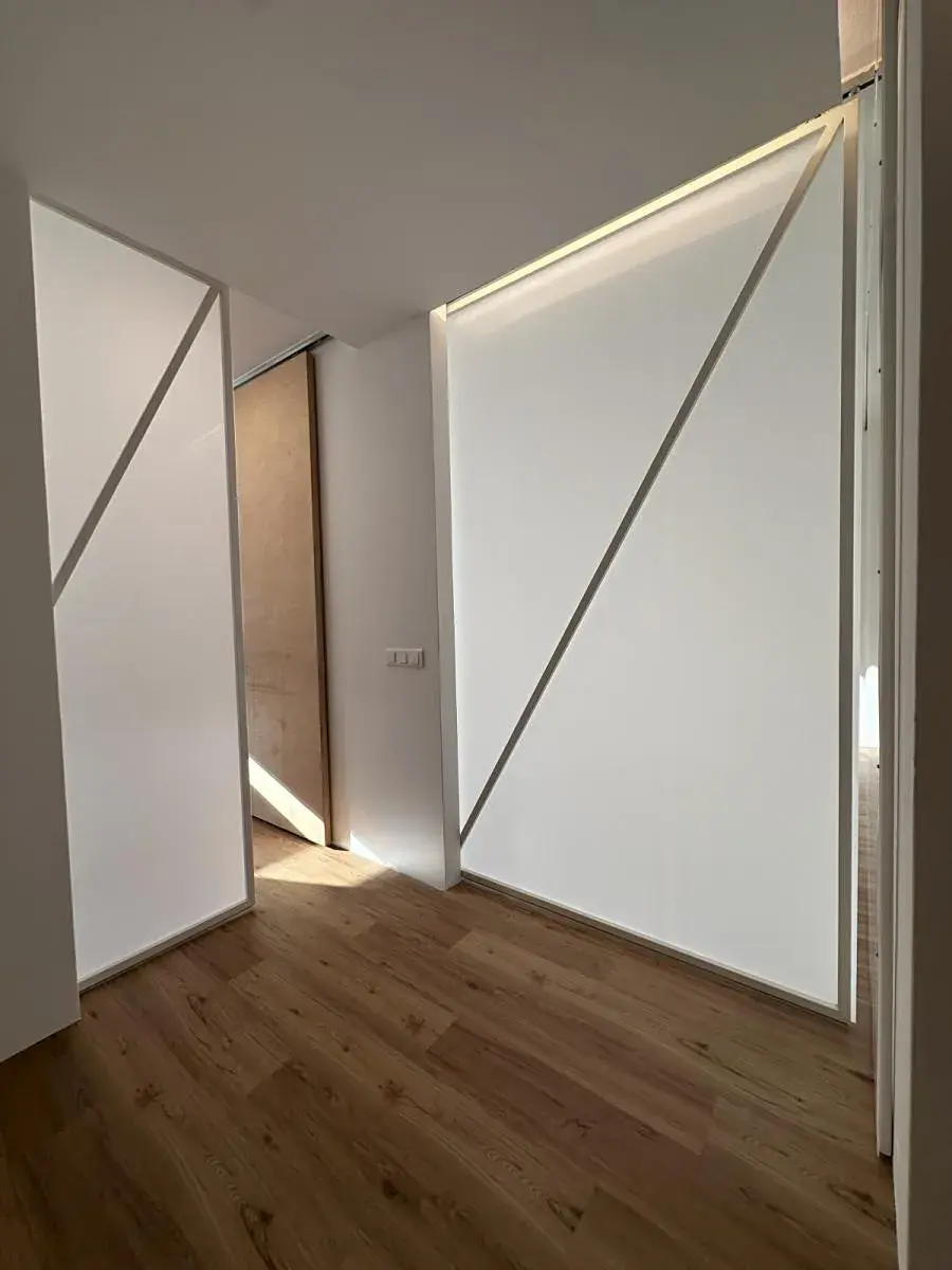 Byt má sdk podhledy se zvukovou izolací. V celém bytě je s výjimkou vstupních dveří pochozí podlaha bez prahů. Okna jsou plastová s novými žaluziemi a sítěmi proti hmyzu, osvětlení bytu je převážně v podhledových nikách. Byt je zařízen širokými posuvnými dveřmi jejichž zavřením se jednotlivé místnosti oddělí nebo naopak celý byt jejich otevřením zprůchodní jako jedna velká místnost.