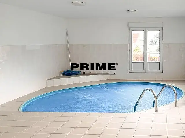 Dispozice přízemí domu: vstupní hala, obývací pokoj s krbem propojený s jídelnou, kuchyň s kuchyňskou linkou a spotřebiči (sklokeramická varná deska, trouba, myčka, lednice s mrazákem, pračka, sušička), ložnice či pracovna, koupelna (s rohovou vanou a sprchovým koutem) a WC. V přízemí je také místnost o velikosti cca 36m2 s vyhřívaným bazénem (s přístupem z obývacího pokoje a z venkovní terasy). 1. patro: 5 ložnic, koupelna (s rohovou vanou), WC a balkon. V suterénu je technické zázemí (sklepy a kotelna).