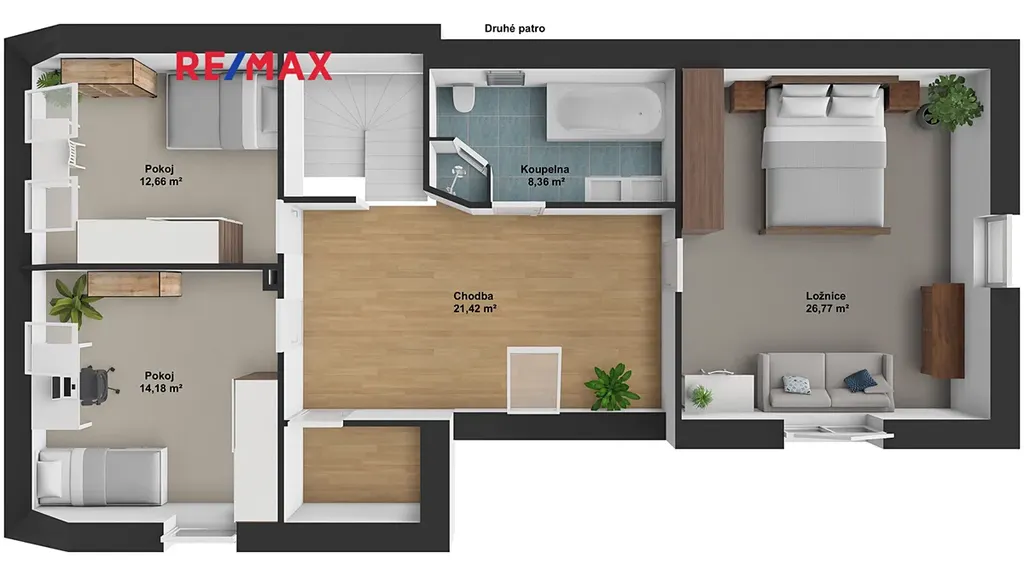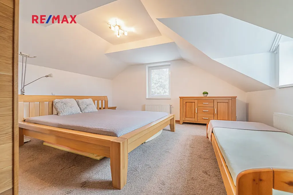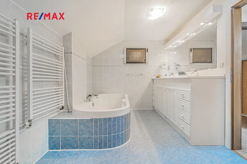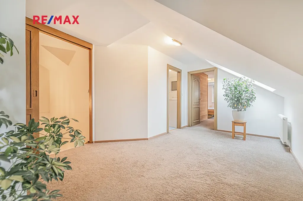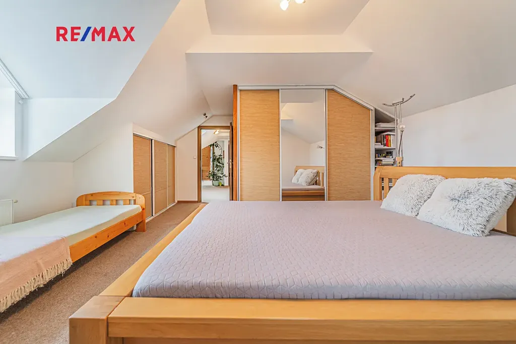 V patře najdete dvě dětské ložnice, hlavní ložnici, pracovnu a druhou koupelnu s vanou, sprchovým koutem a toaletou.