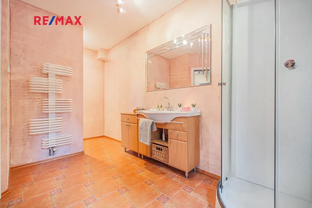 Součástí přízemí je také spíž, koupelna se sprchovým koutem a toaletou a praktická technická místnost.