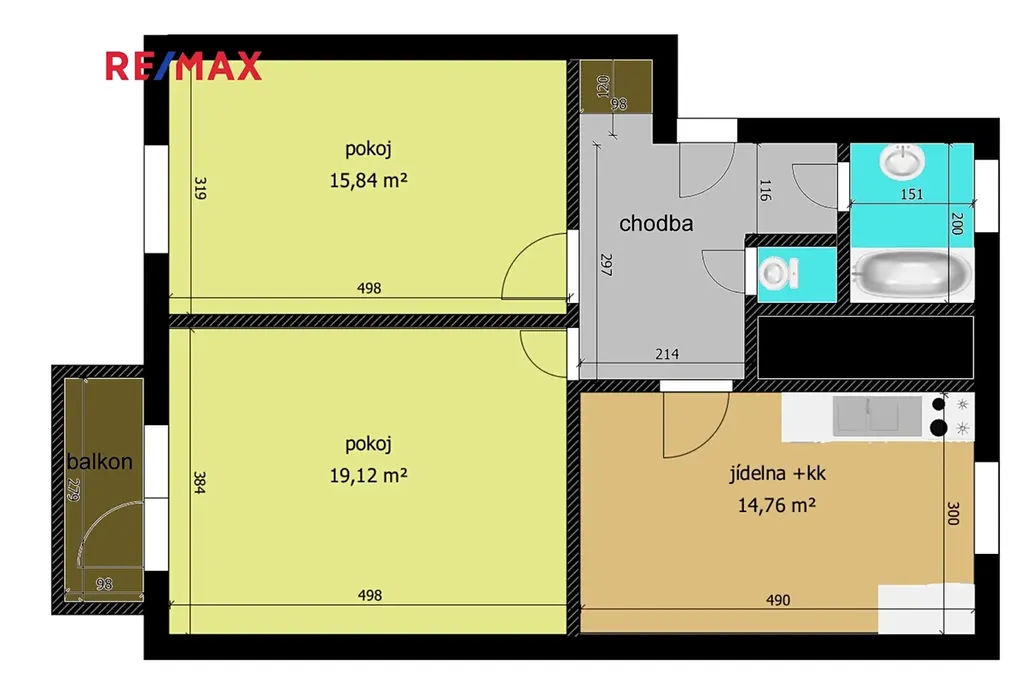 Dispozice bytu nabízí dva prostorné pokoje o velikosti 19,12 m² a 15,84 m², jídelnu s kuchyňským koutem o výměře 14,76 m², koupelnu se sprchovým koutem, samostatné WC a komoru. Součástí bytu je rovněž sklep v suterénu domu.