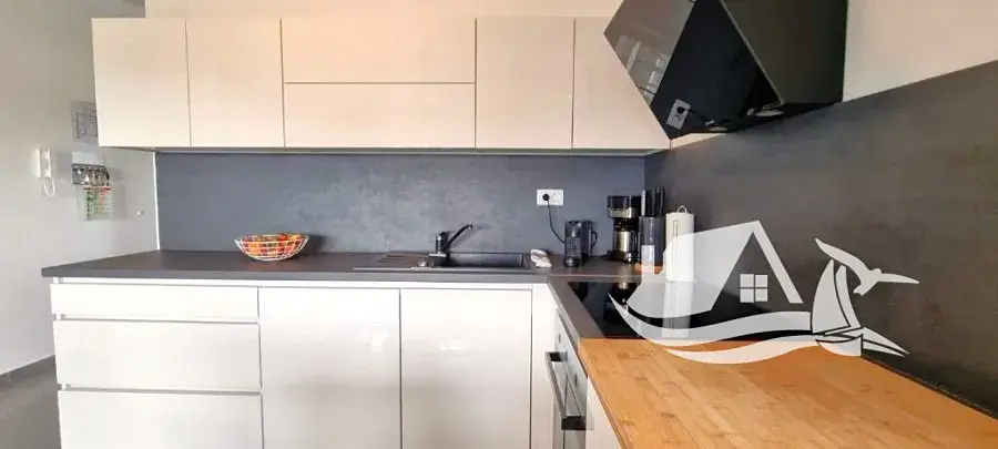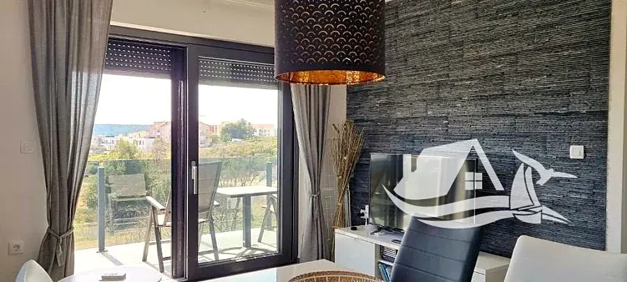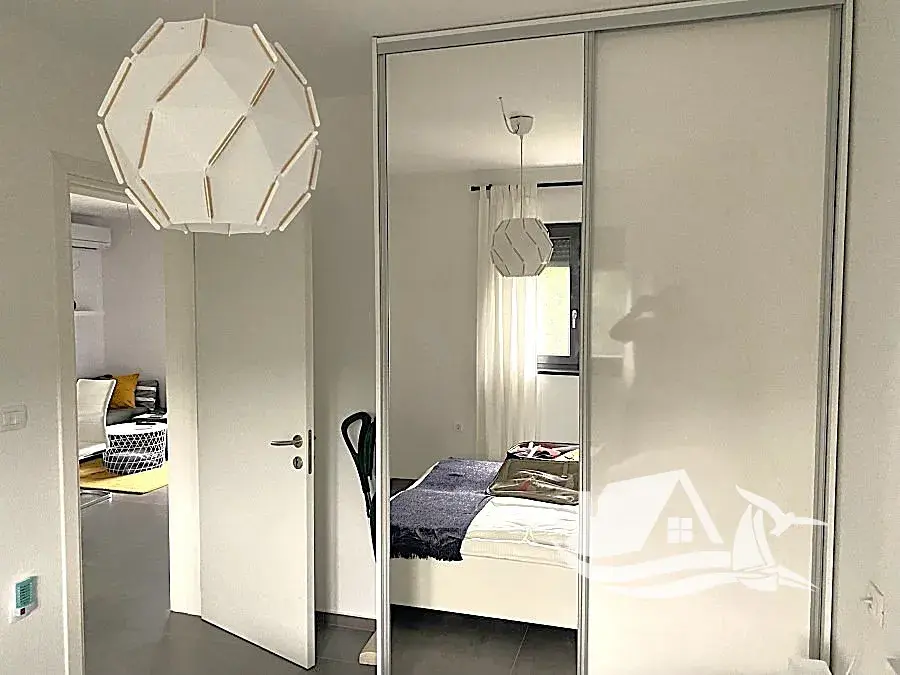 Dispozice zahrnuje prostorný obývací pokoj propojený s kuchyní a jídelním koutem, dvě ložnice, koupelnu a terasu s příjemným výhledem na moře. Terasa přirozeně rozšiřuje obytný prostor a nabízí ideální místo pro ranní kávu i večerní posezení. Součástí prodeje je také vyhrazené parkovací místo, což je v této lokalitě výrazný benefit.