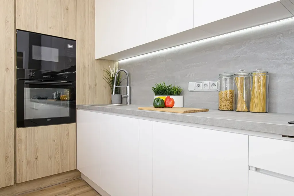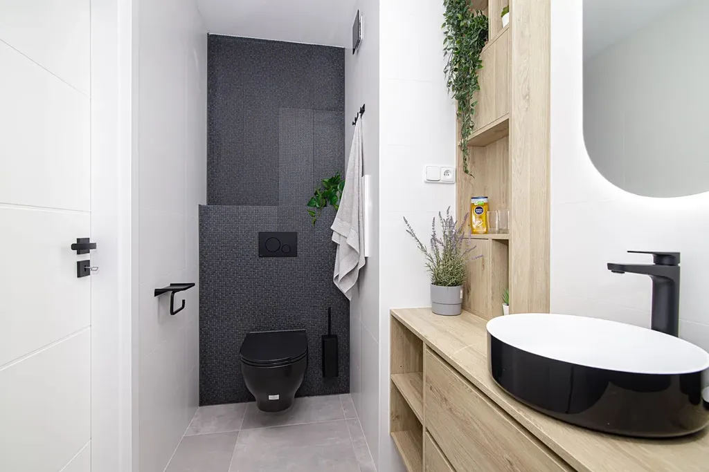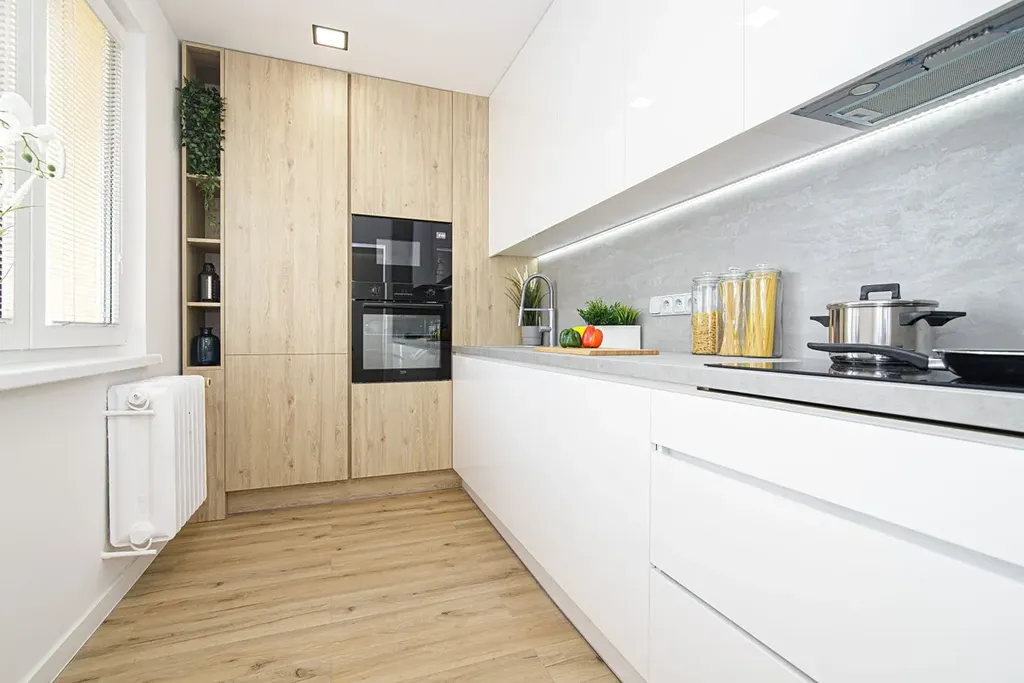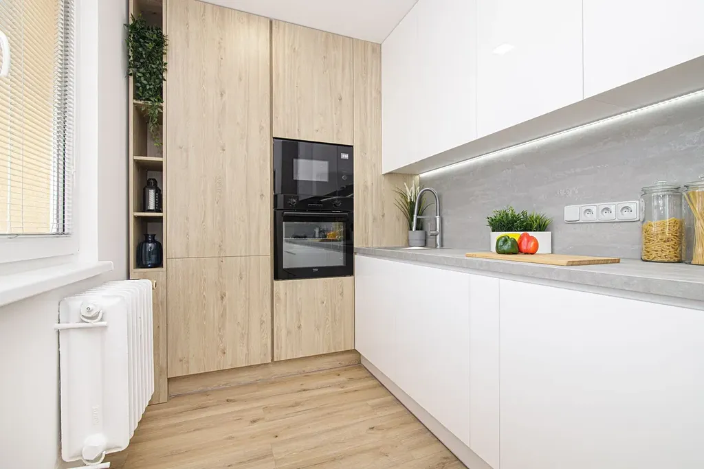 V bytě je vše nové - vylité anhydritové podlahy s vinylovou krytinou, sádrové omítky, elektroinstalace, LED osvětlení, podhledy, luxusní kuchyně vybavená vestavěnými spotřebiči a rozšířená koupelna spojená s WC.