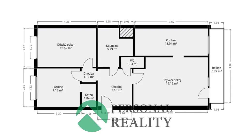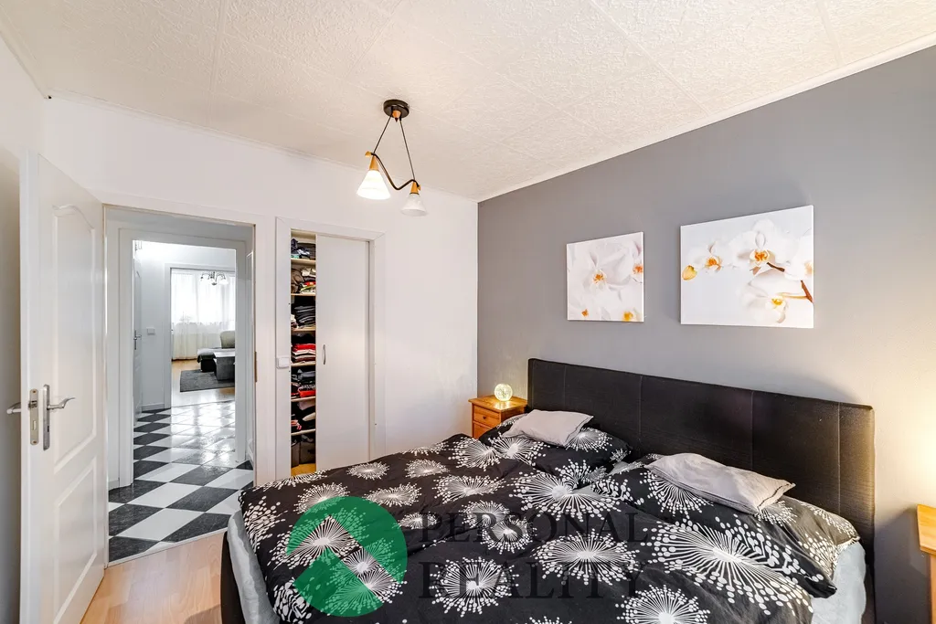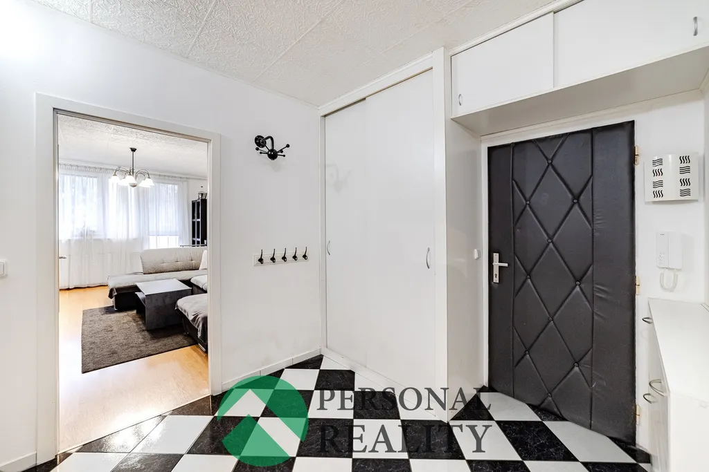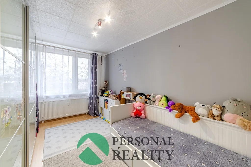 Dispozice bytu: Byt se nachází v prvním patře, druhé nadzemní podlaží, z celkových 10 pater. K dispozici jsou 2 nákladové výtahy. K bytu náleží sklopní kóje. Byt je velice prostorný. Najdeme zde prostornou chodbu s úložným prostorem, obývací pokoj, kuchyň s jídelním koutem, dětský pokoj, ložnici s šatnou, prostornou koupelnou, kde proběhla rekonstrukce a došlo tak ke zvětšení prostoru. V koupelně najdeme vanu i sprchový kout. WC jako místo vedlejší. Podél obývacího. pokoje a kuchyně vede zasklená lodžie.