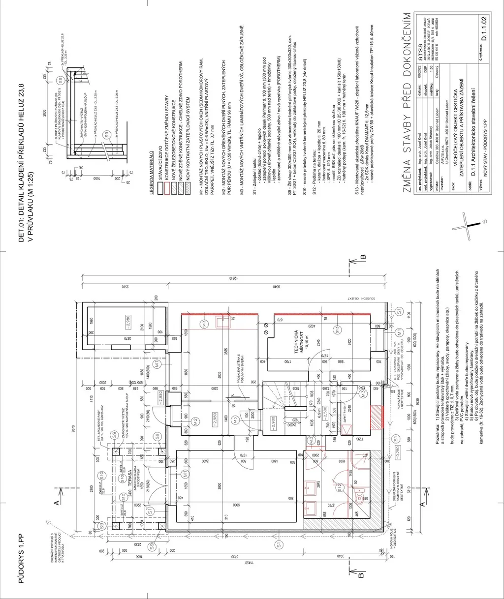 V novém projektu se počítá s podlahovou plochou 1. NP (v úrovni zahrady pozemku) o cca 58 m2. Skládá se z centrální chodby, předsíně, koupelny, která zároveň slouží jako technická místnost, šatny, kuchyně s jídelnou a obývacího pokoje. Jídelna a obývací pokoj mají okna do zahrady ve vnitrobloku. Projekt počítá s vybudováním terasy o cca 6,5 m2, orientovanou do zahrady, na kterou se vchází z obývacího pokoje v 1. NP.