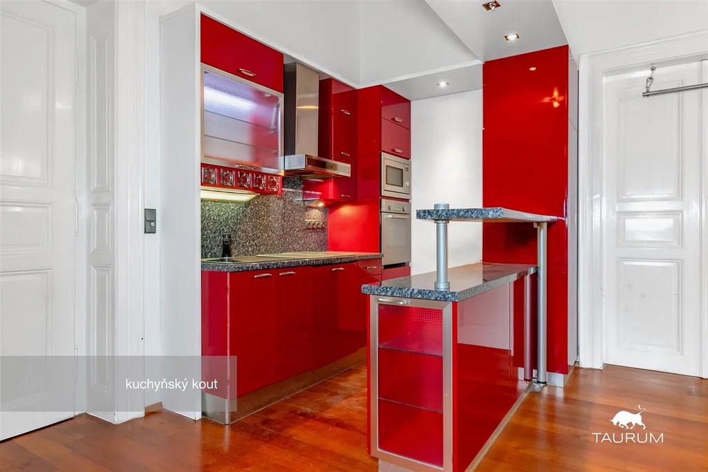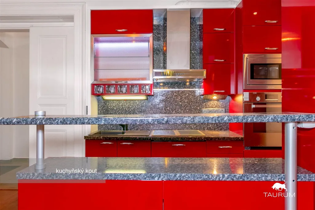 umístěný v 1. patře cihlového domu. Je částečně vybavený – lednice, trouba, mikrovlnka, myčka, digestoř, indukční varná deska, skříně.