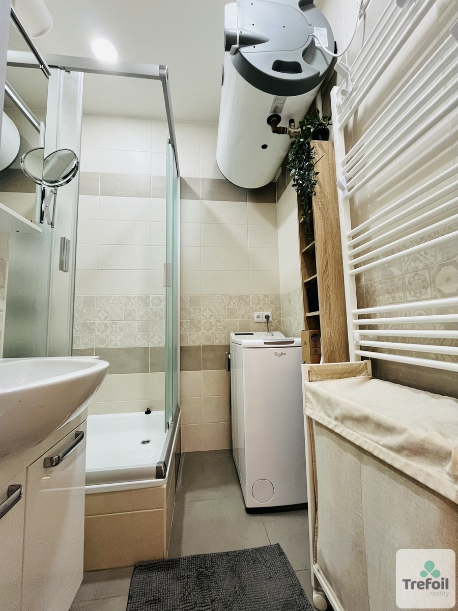 koupelna se sprchovým koutem, umyvadlem a pračkou