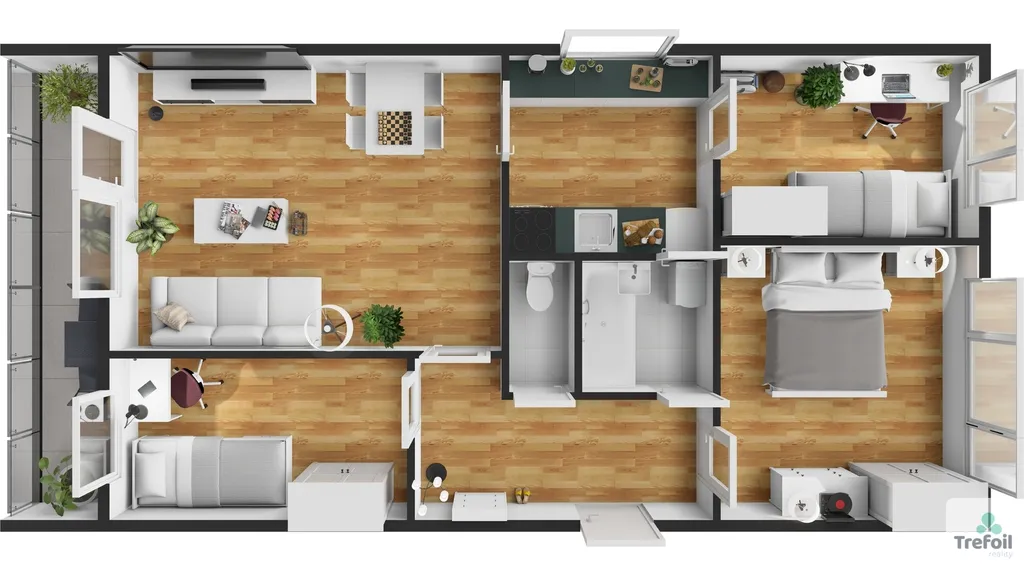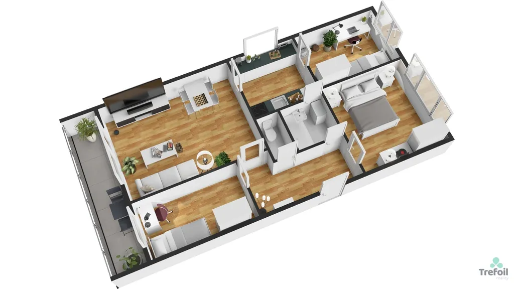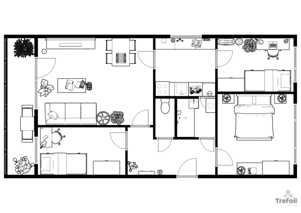 Dispozičně je byt velmi dobře řešený – z předsíně se vstupuje do koupelny, samostatného WC, ložnice, obývacího pokoje a dvou dalších pokojů. Kuchyně je přístupná z obývacího pokoje a navazuje na další samostatný pokoj, což nabízí mnoho možností uspořádání prostoru.