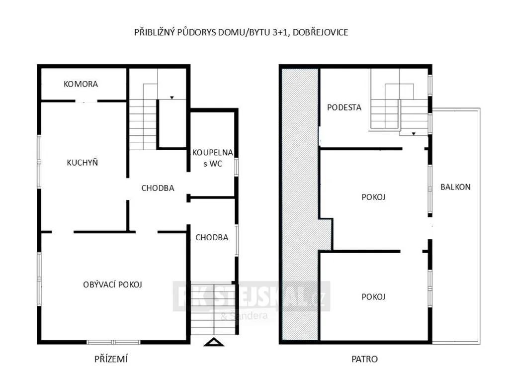 - přízemí: kuchyň, obývací pokoj, komora a koupelna s toaletou, patro: dva pokoje (jeden průchozí)