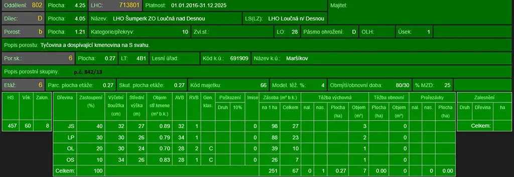 - p.č. 842/11 vedená jako lesní pozemek o celkové výměře 5 282 m2 (stáří lesa 126 let - zastoupení dřevin lípa, smrk, bříza, stáří lesa 60 let - zastoupení dřevin olše, lípa, bříza, jasan),