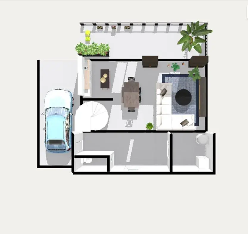 Přízemí: obývací pokoj s kuchyňským koutem 31 m2 a vstupem na prostornou terasu 23,3 m2, schodiště 4,4 m2, zádveří 7,2 m2, toaleta 1,3 m2, technická místnost 5,5 m2, průjezd 26,3 m2.