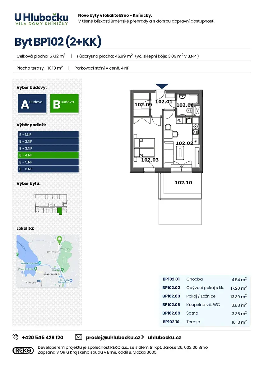 Nabízíme k prodeji byt o dispozici 2+kk s celkovou podlahovou plochou 43,90 m², který disponuje šatnou a jednou terasou o celkové výměře 10,13 m². Byt se nachází v 4.NP moderního terasového viladomu s výtahem v projektu U Hlubočku, dům B, v atraktivní lokalitě Brno–Kníničky. Orientace bytu je na východ s krásným výhledem na Mniší horu. V případě zájmu lze dokoupit parkovací stání.