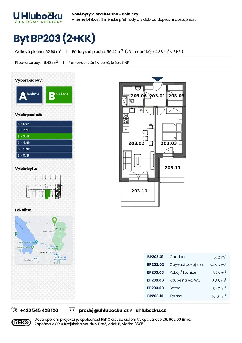 Nabízíme k prodeji byt o dispozici 2+kk s celkovou podlahovou plochou 52,04 m², který disponuje šatnou a jednou terasou o celkové výměře 16,61 m². Byt se nachází v 3.NP moderního terasového viladomu s výtahem v projektu U Hlubočku, dům B, v atraktivní lokalitě Brno–Kníničky. Orientace bytu je na východ s krásným výhledem na Mniší horu. V případě zájmu lze dokoupit parkovací stání.