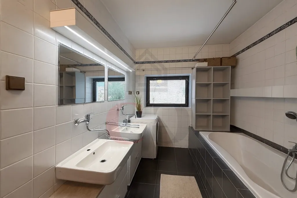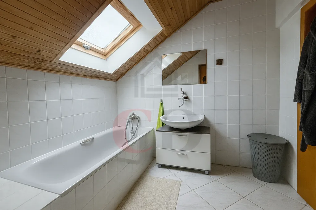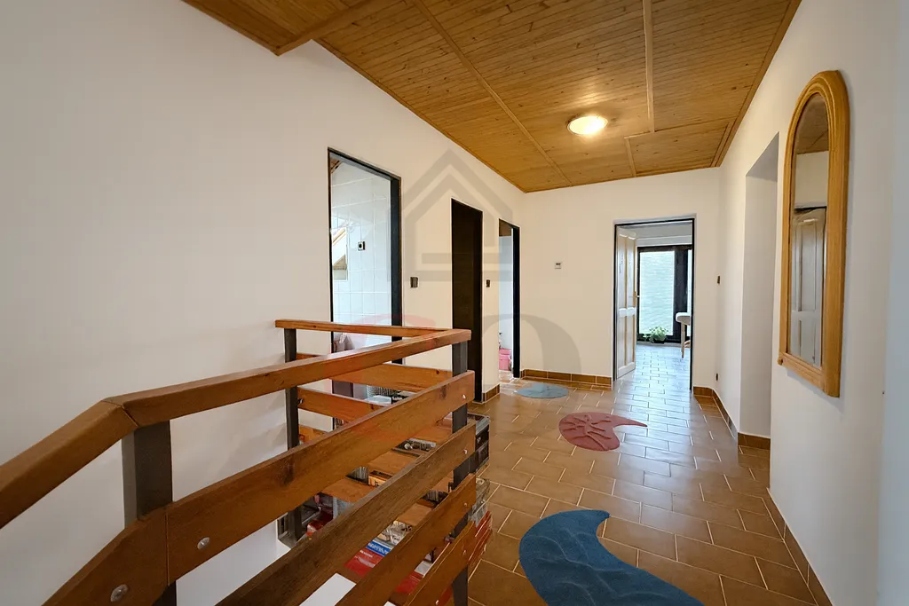 V patře domu jsou k dispozici čtyři pokoje, koupelna, toaleta a šatna.
