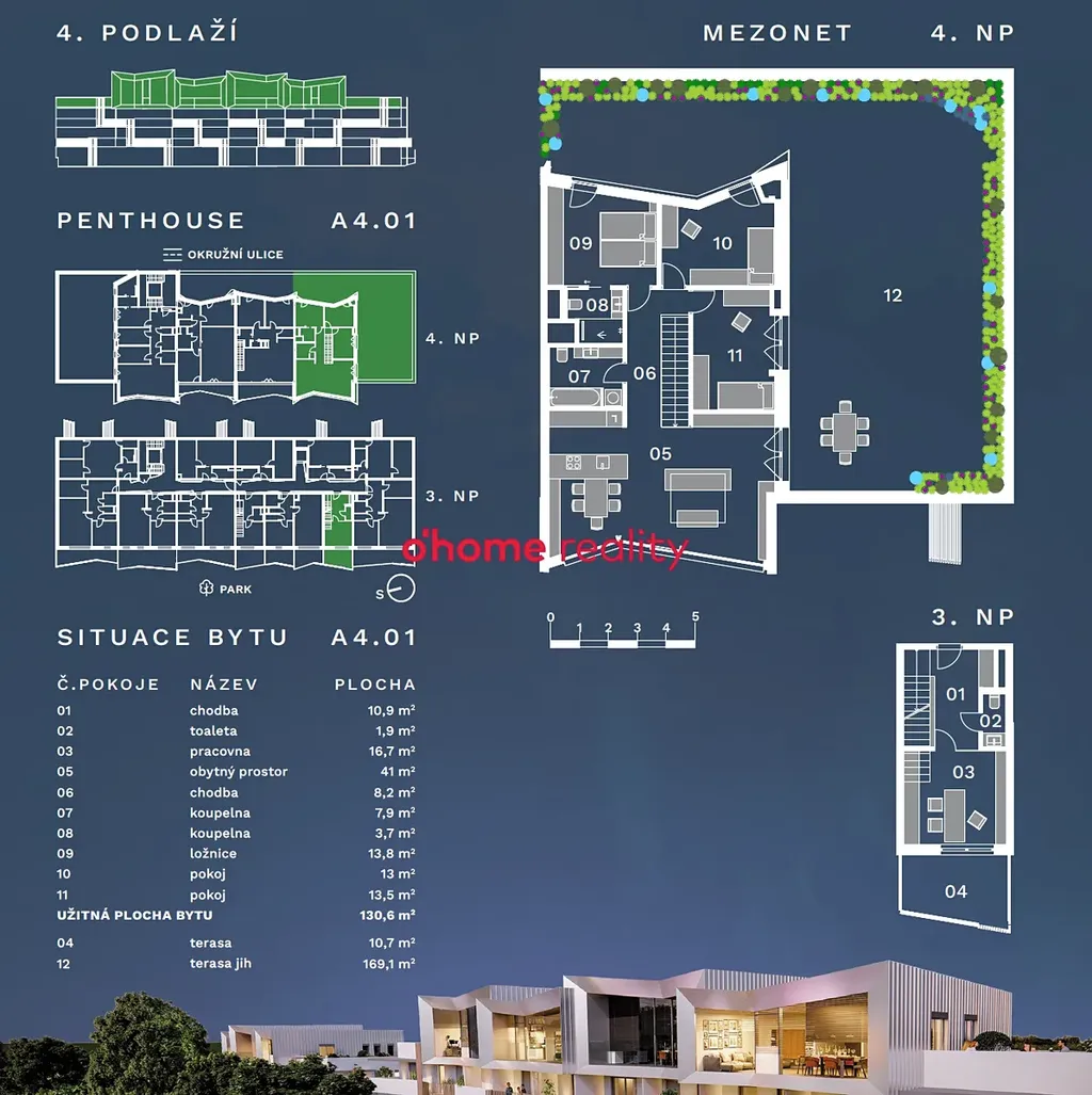 Nabízíme exkluzivní penthouse, který uspokojí i ty nejnáročnější klienty. Tento "rodinný dům" na střeše se pyšní rozsáhlou terasou a dechberoucími výhledy na historické centrum Olomouce i panorama Jeseníků. Každý penthouse je originál - tento nabízí mezonetové řešení s dispozicí 5+kk, podlahovou plochou 131 m2 a střešní terasou o velikosti 180 m2.