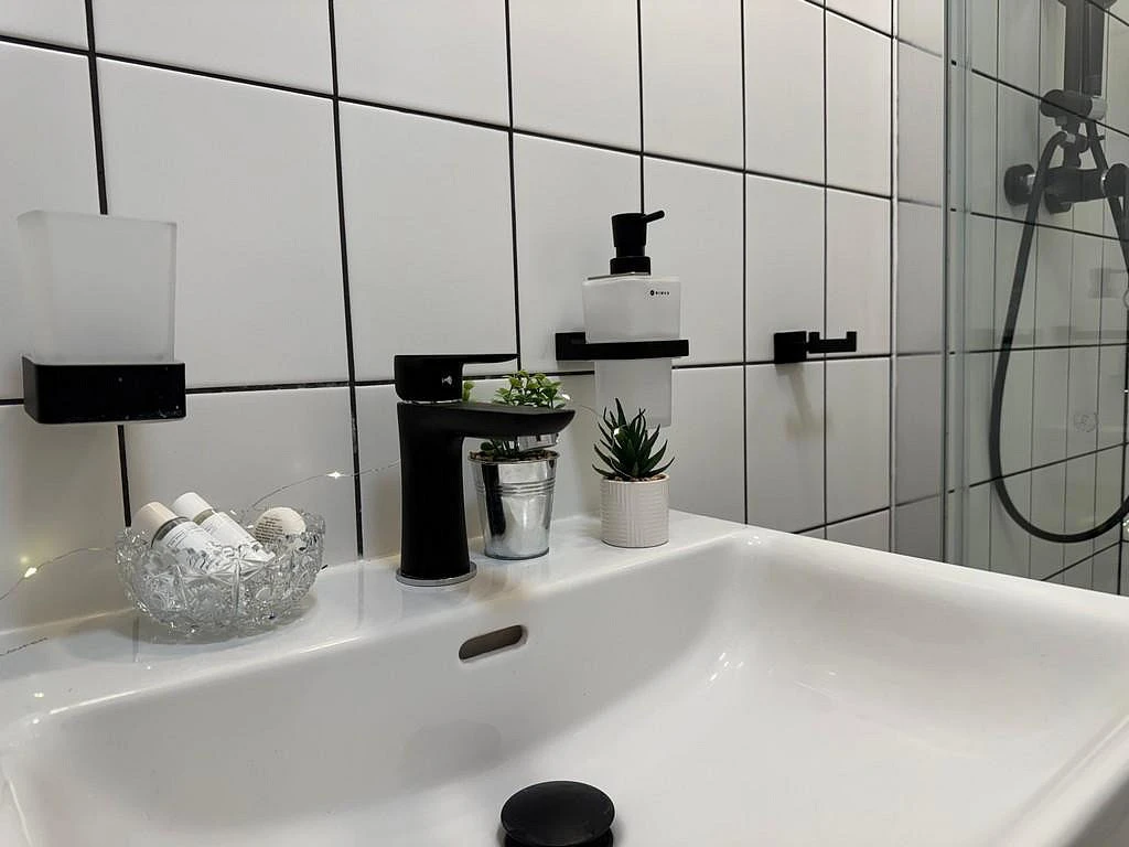 Koupelna o rozloze 7,4 m je vybavena sprchovým koutem, umyvadlem, WC, otopným žebříkem a přípravou na automatickou pračku.