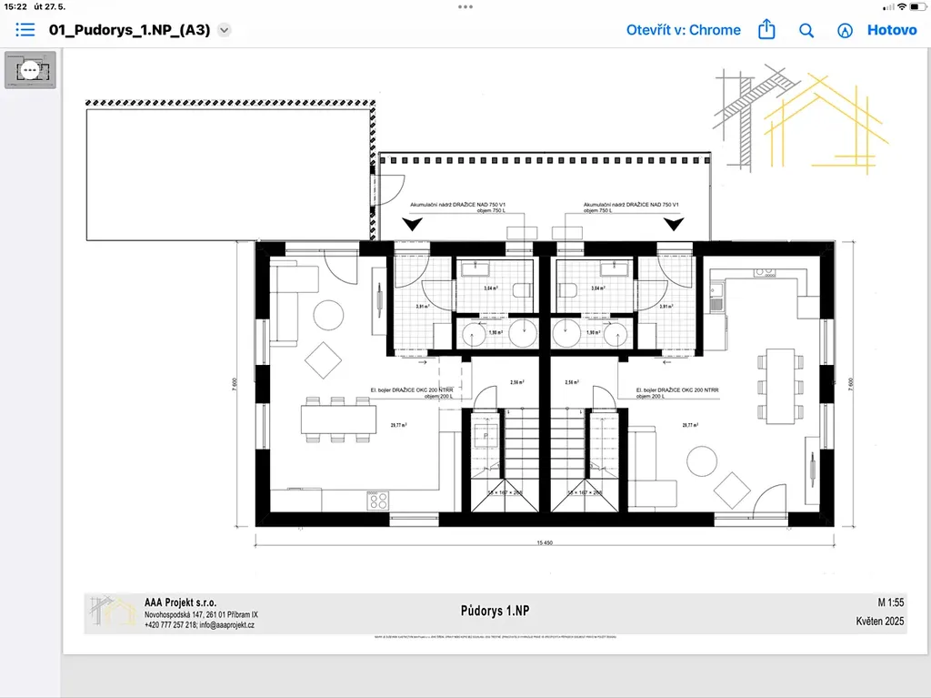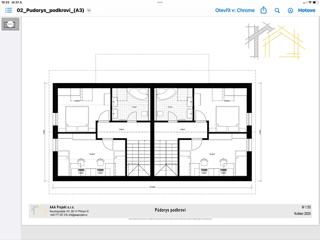 V patře domu se nacházejí dva prostorné pokoje o velikosti 16,26 m² a 13,04 m². Oba pokoje jsou prosvětleny kombinací střešních oken a jednoho klasického okna, což zajišťuje příjemnou světlost po celý den. Koupelna s vanou a toaletou je rovněž vybavena střešním oknem, které přispívá ke komfortu přirozeného osvětlení i účinnému větrání.