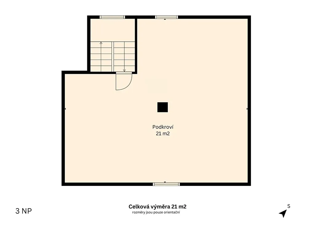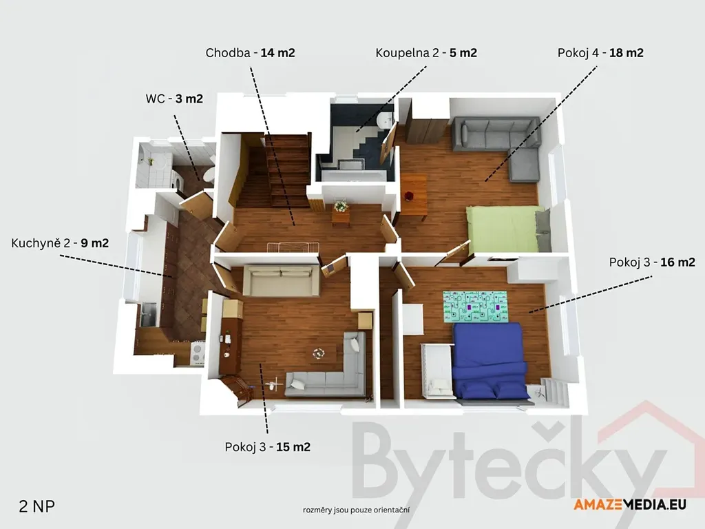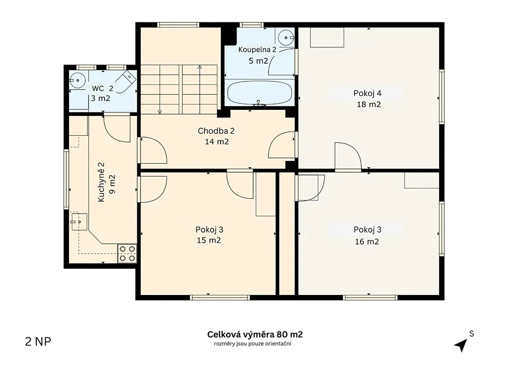 2NP (patro): kuchyň, WC, chodba, koupelna s vanou, 3 pokoje, schodiště na půdu 80 m