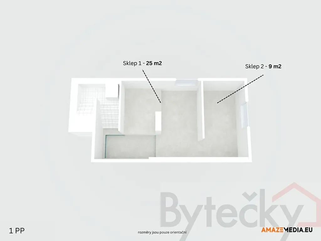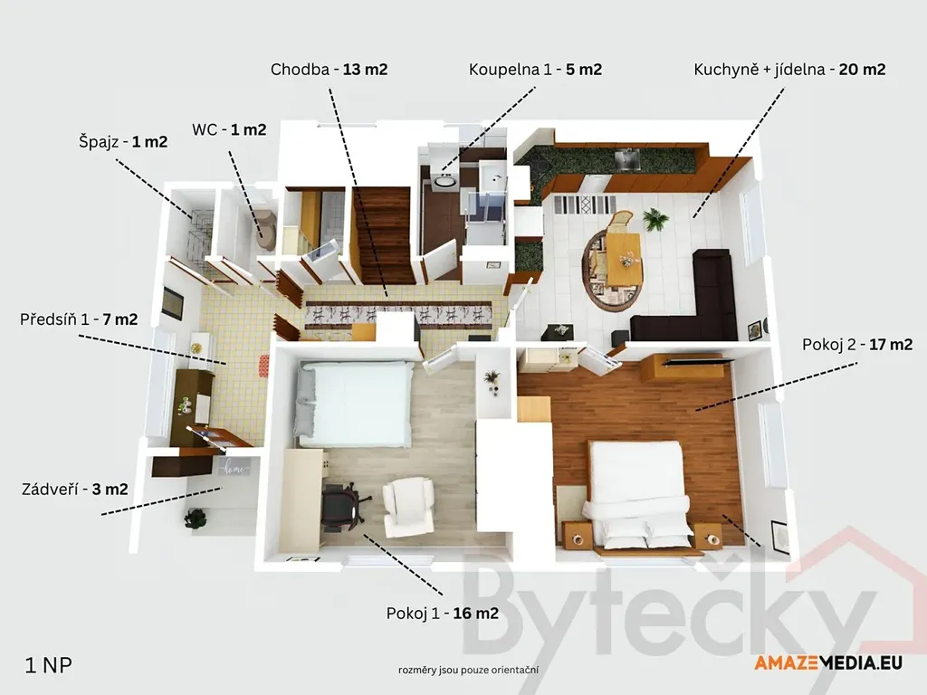 1NP (přízemí): kuchyň, 2 pokoje, chodba, koupelna se sprchovým koutem, WC, špajz, zádveří, schodiště do sklepa i patra 80 m