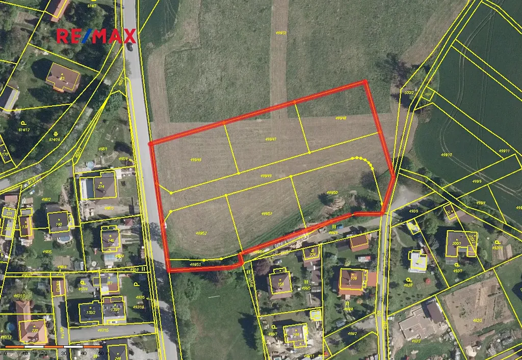 Pozemek vhodný pro menší developerské projekty (je nyní rozdělen na šest parcel, s výměrami mezi 1.082 m2 až 1.204 m2 a cestu mezi parcelami).