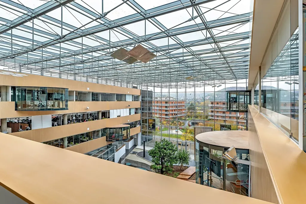 Prosklená budova ve tvaru písmene U s pěti nadzemními a dvěma