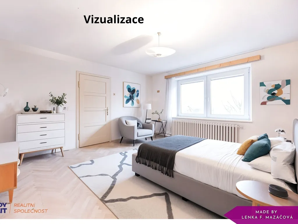 Dále je v patře prostorná šatna, kterou lze využít i jako pracovnu, a další menší šatna určená pro uložení věcí. Součástí patra je samostatné WC a koupelna vybavená vanou i sprchovým koutem.