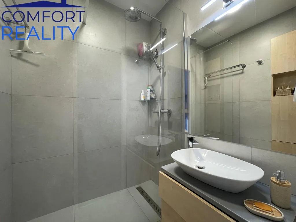 Interiér prošel před třemi lety velmi vkusnou modernizací. Vyzděné bytové jádro ukrývá koupelnu se sprchovým koutem, kuchyně je osazena atraktivní linkou s vestavnými spotřebiči a celým prostorem prochází sjednocená vinylová podlaha. Promyšlené úložné prostory v předsíni zajišťuje prostorná šatní skříň na míru. Díky jižní orientaci je byt po celý den zalitý sluncem a působí velmi útulně.