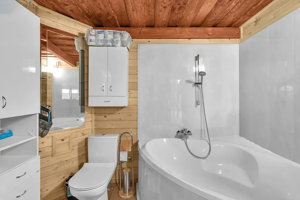 Přízemí: prostorná společenská místnost s plně vybavenou kuchyní, jídelním stolem a sporákem na tuhá paliva, koupelna s rohovou vanou a WC, ložnice, technická místnost s dalším WC.