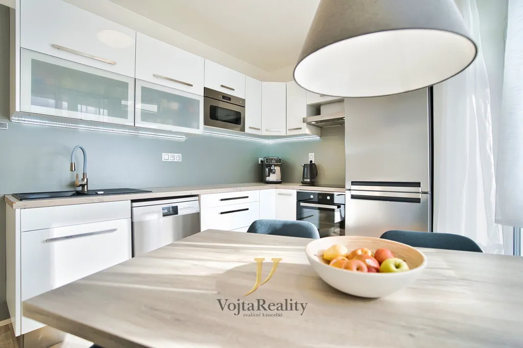 Kuchyňská linka je vybavena vestavěnými spotřebiči – indukční varnou deskou, myčkou nádobí, elektrickou i mikrovlnnou troubou, lednicí s mrazicím boxem a komínovou digestoří. Součástí kuchyně je také komora. V kuchyni, obývacím pokoji i ložnici jsou instalovány klimatizační jednotky. Mezi ložnicí a dětským pokojem se nachází prostorná šatna.