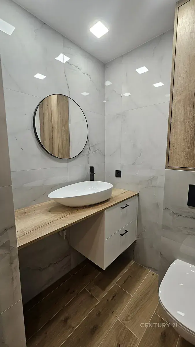 Designová koupelna: sprchový kout, velkoformátové obklady, podsvícené zrcadlo (použitý dekor dřevo a mramor)