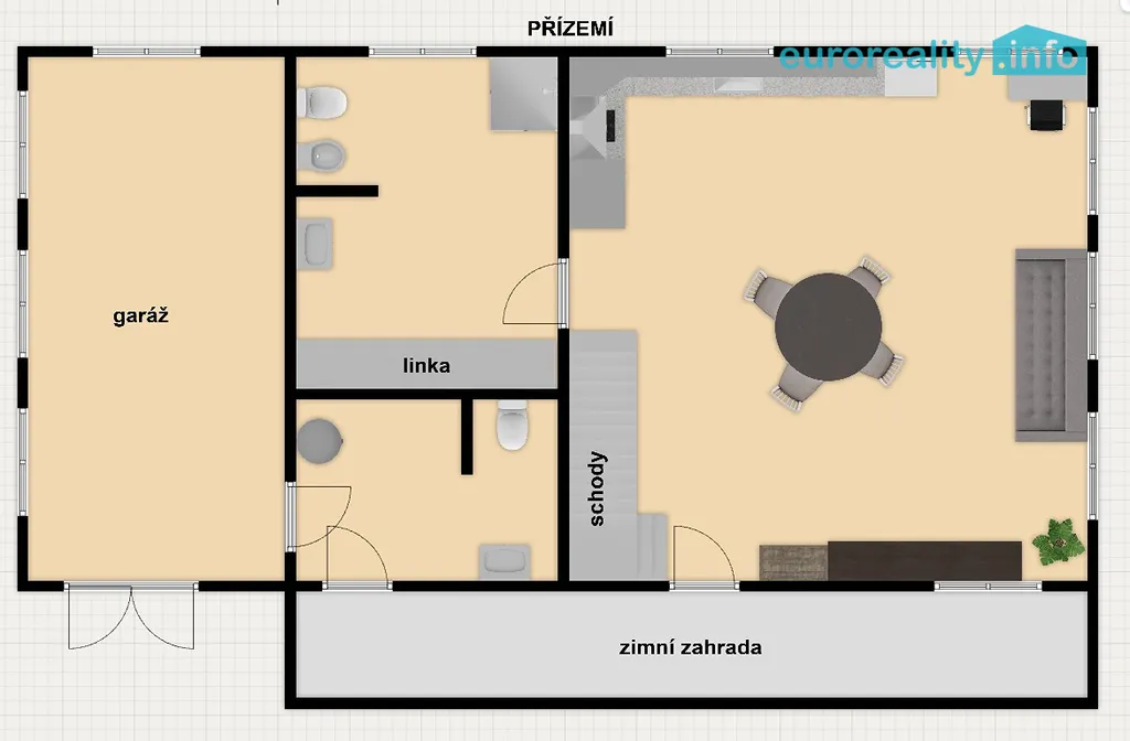 V přízemí je obývací pokoj s kuchyňskou linkou, koupelna s prádelnou, WC, WC pro hosty a také přímý vstup do velké garáže pro dva automobily.