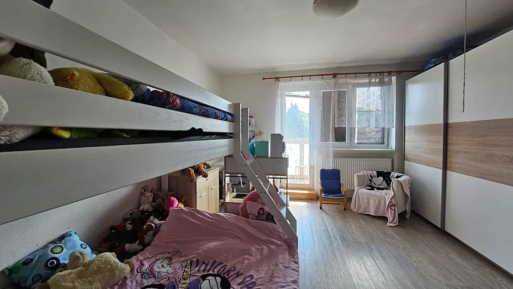Dispozice zahrnuje vstupní chodbu, ložnici, dětský pokoj, kuchyň s obývacím koutem, koupelnu a samostatné WC.