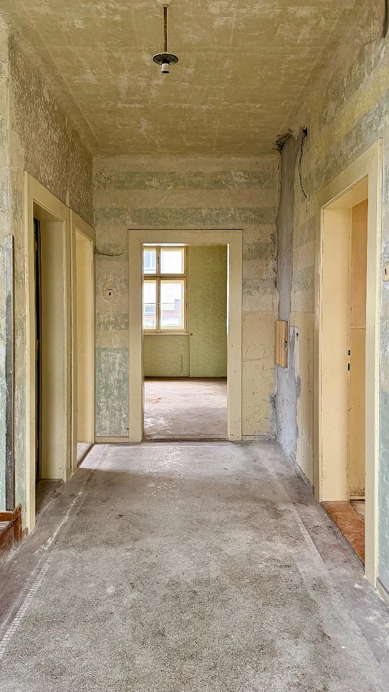 Původní masivní, kazetové dveře: Mistrovská truhlářská práce s dobovým kováním, která dodává každému vstupu pocit poctivosti.