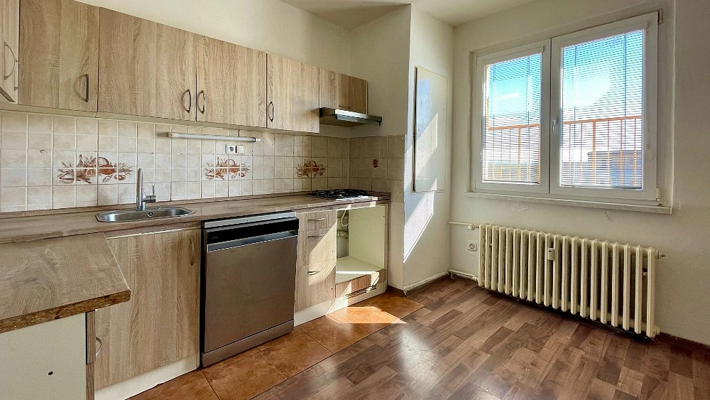 Byt zahrnuje tři samostatné pokoje, když obývací pokoj je velmi slunný, osvětlený z obou protilehlých stran a prostorná kuchyň, což nabízí dostatek prostoru pro rodiny či páry hledající domov s několika místnostmi. Byt má zděné jádro, koupelnu s vanou a WC je umístěno samostatně. Jedná se o ideální bydlení pro ty, kteří preferují bydlení ve vyšších patrech, s krásným výhledem a pocitem soukromí. K bytu také náleží sklepní prostor, který poskytuje další úložné možnosti.
