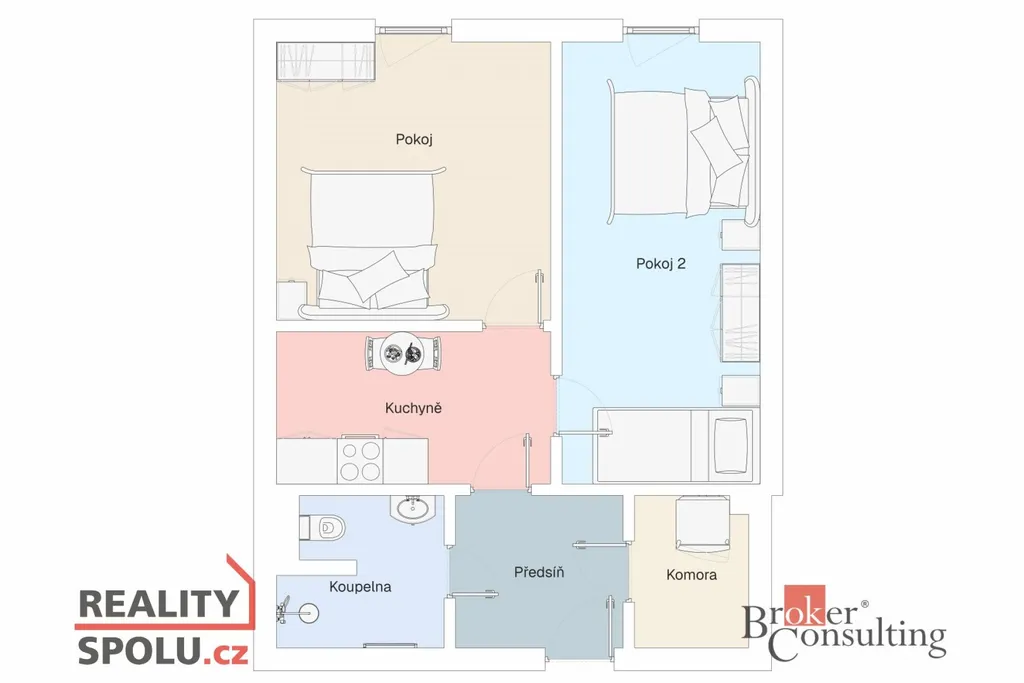 Dispozice bytu zahrnuje dva samostatné pokoje, oddělenou kuchyni s možností jídelního stolu, koupelnu s toaletou a praktickou komoru přímo v bytě naproti chodbě. Jednotka je v udržovaném stavu, osazena plastovými okny a připravena k okamžitému užívání.
