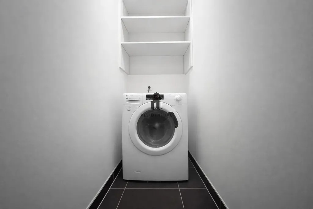 Dispozice bytu zahrnuje prostorný obývací pokoj s kuchyňským koutem, pohovkou, TV a vstupem na balkon. V ložnici se nachází dvoulůžková postel a šatní skříň. Koupelna je vybavena vanou a WC. Součástí bytu je také samostatná komora s pračkou.